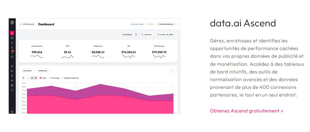 dData.ai combine les données des consommateurs et du marché avec la puissance de l’intelligence artificielle pour fournir des informations. Avec des données sur plus de 8 millions d’applications et des milliers de sites Web, Data.ai propose des produits tels que l’intelligence, Ascend et ConnectPlus pour aider à gérer, enrichir et identifier des opportunités de performances cachées entre les données publicitaires et de monétisation. L’outil propose également des versions gratuites et premium de ses produits à des clients dans plusieurs secteurs ( jeux, services bancaires, fintech, etc). Data.ai vise à aider ses 1 400 clients à optimiser le retour sur investissement.